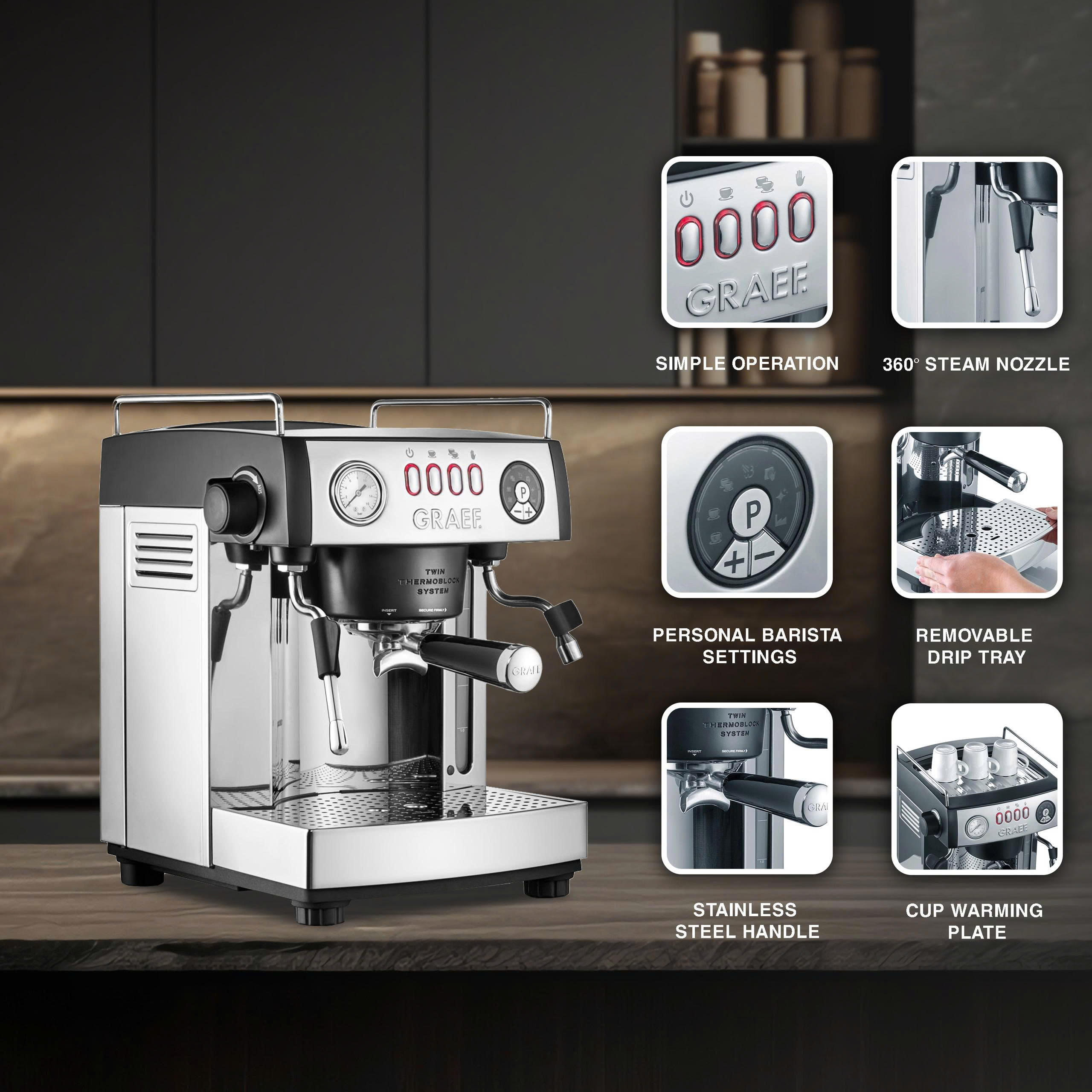 Controls: Buttons for single and double espresso shots, plus manual handling for full control.