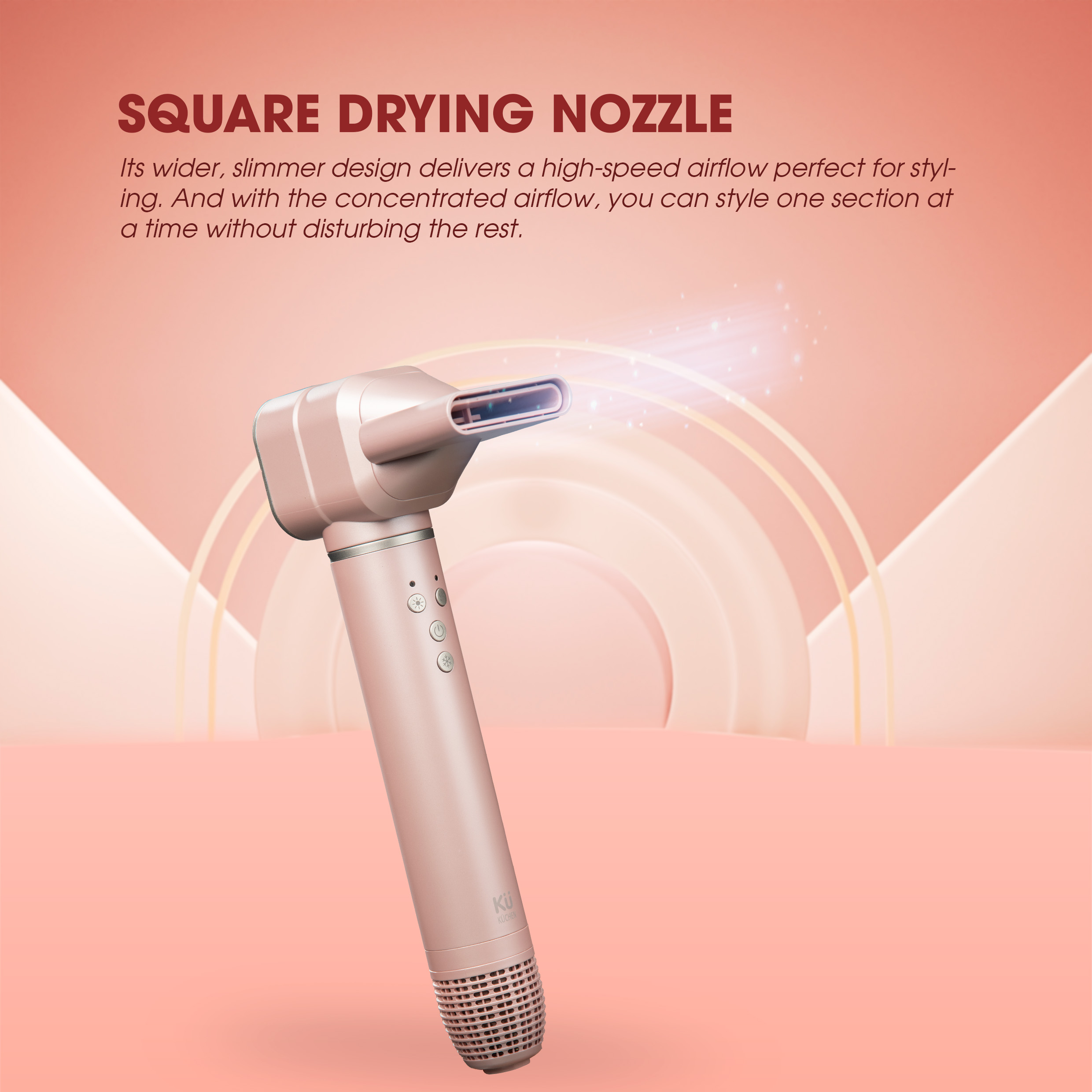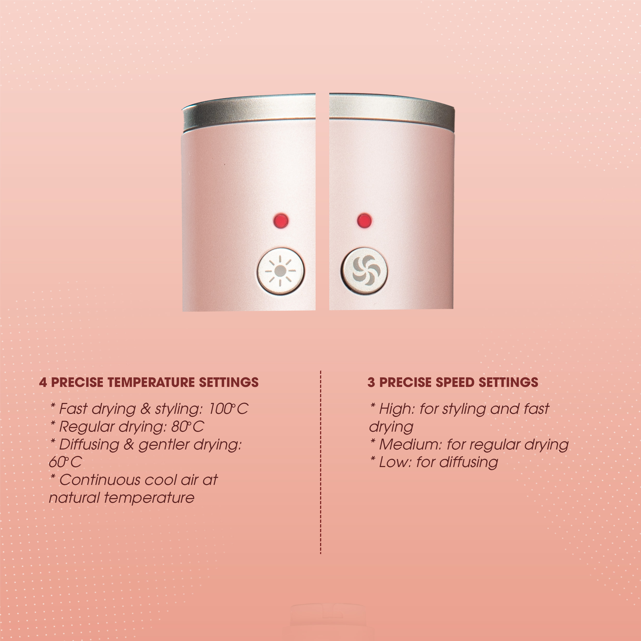 Airflow & Temperature Settings: 3 airflow levels with high air volume, 4 temperature levels for versatile styling.