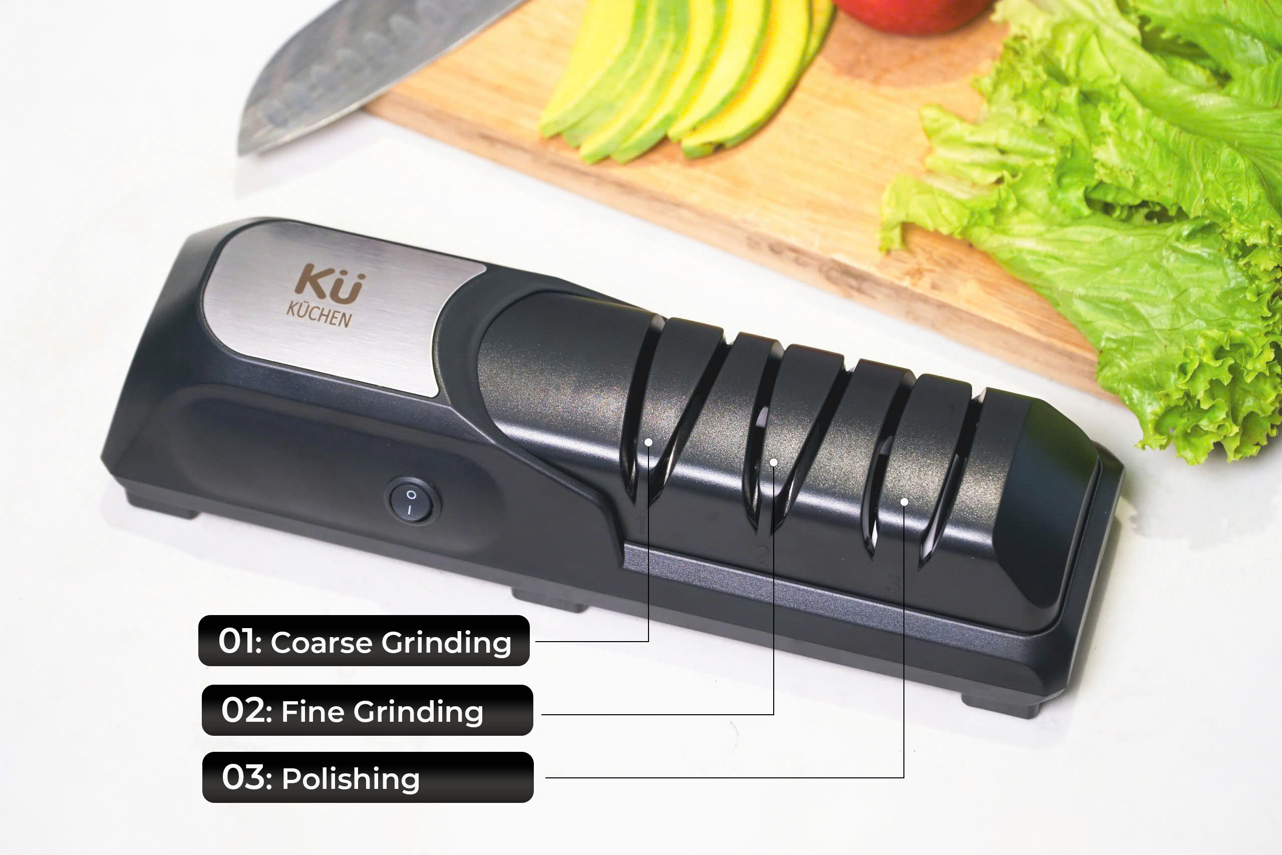 Grit sizes: 360 (coarse), 600 (fine), 1200 (polishing) – delivering outstanding sharpening efficiency, even for hard steel and ceramic knives