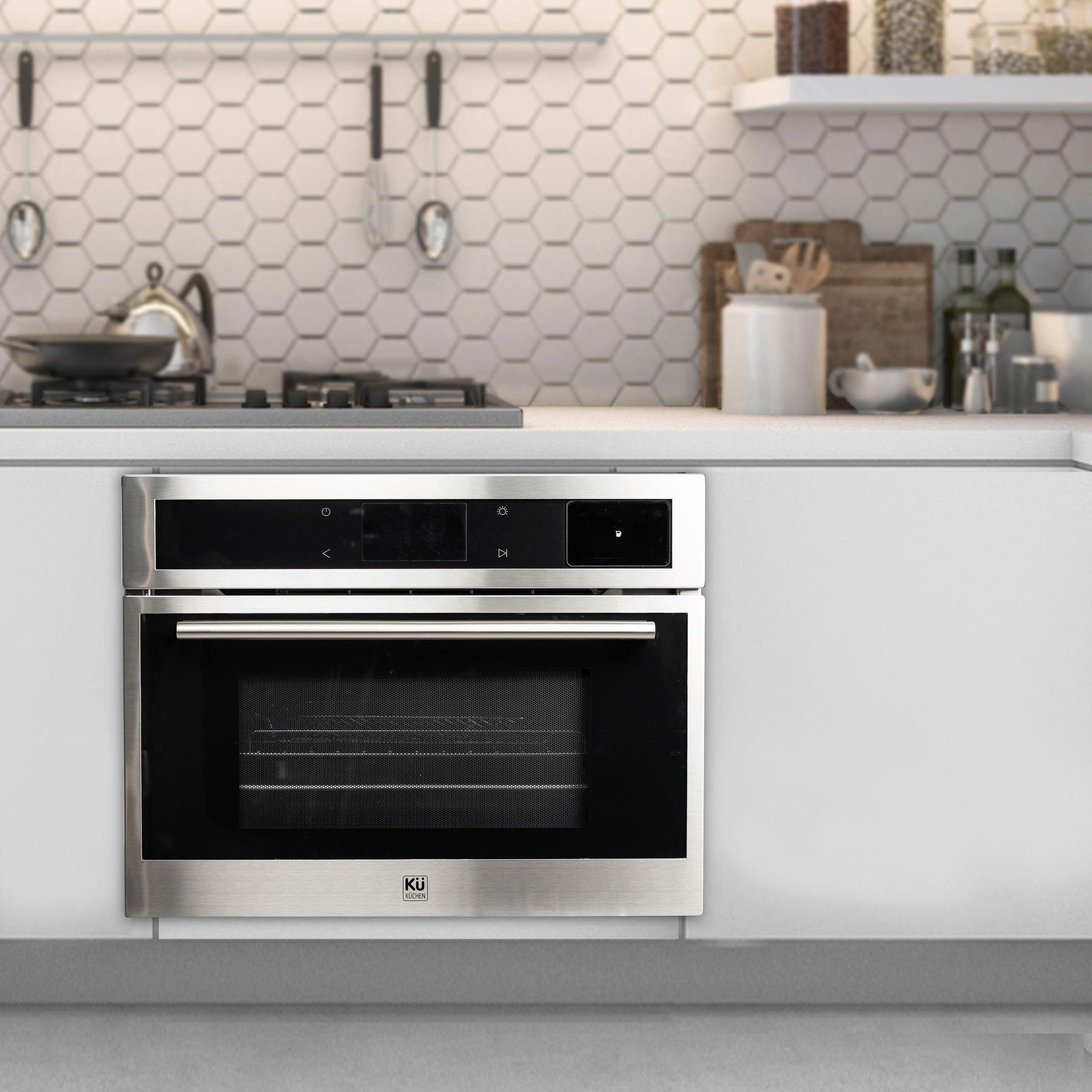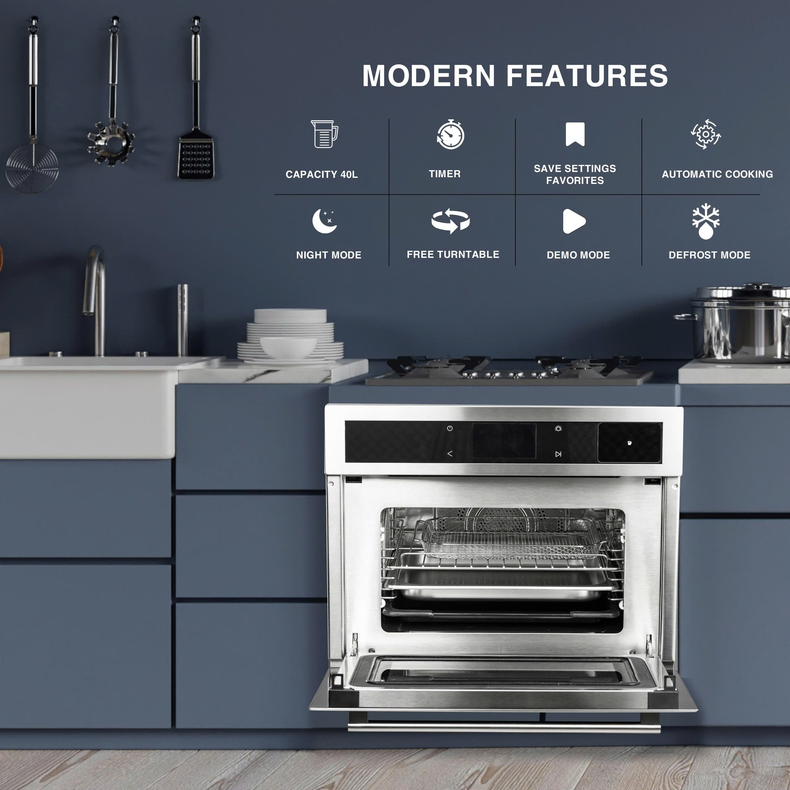 High-quality stainless steel with black tempered glass, giving the oven a luxurious look and easy integration into any kitchen.