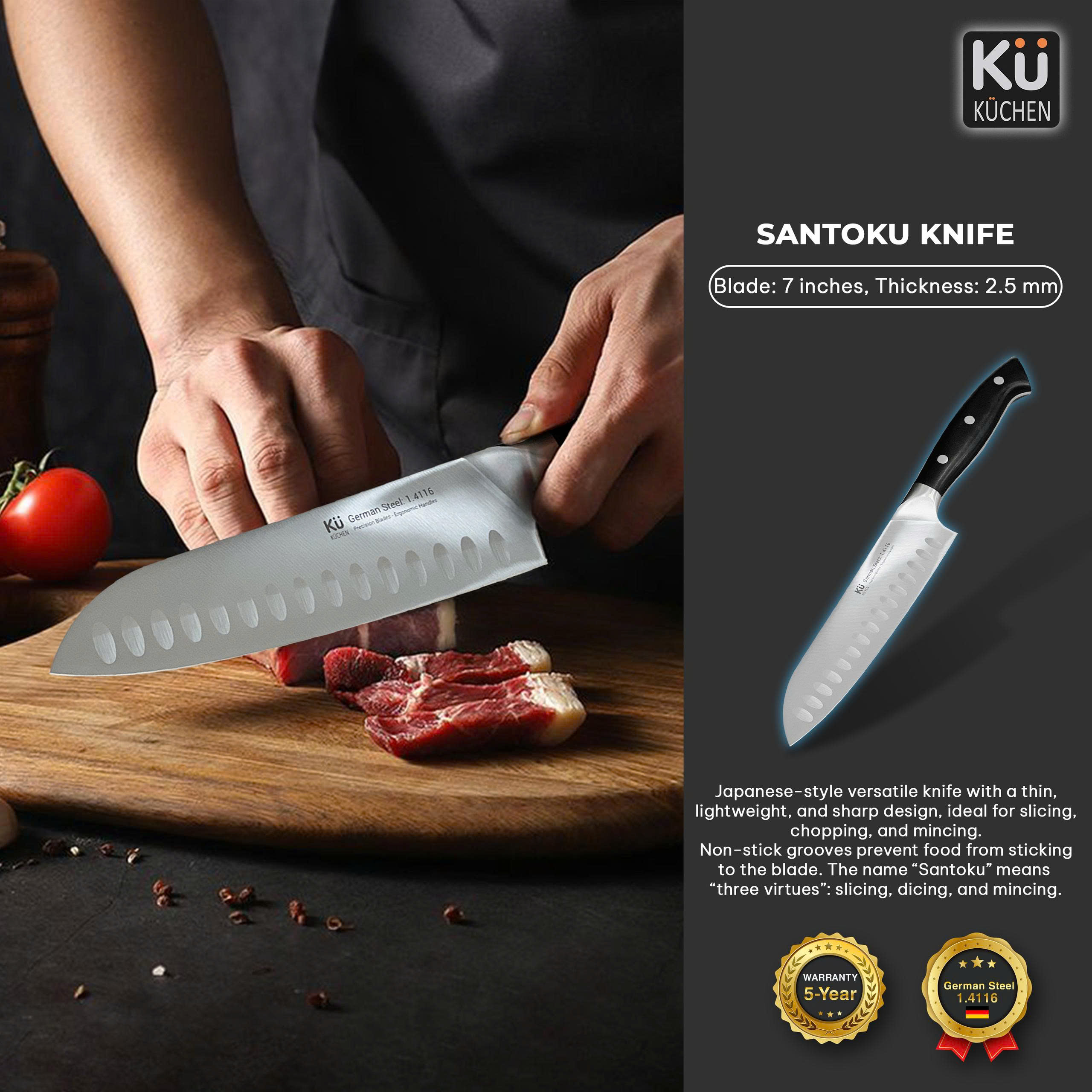 • Santoku & chef knives with anti-stick groove for effortless cutting