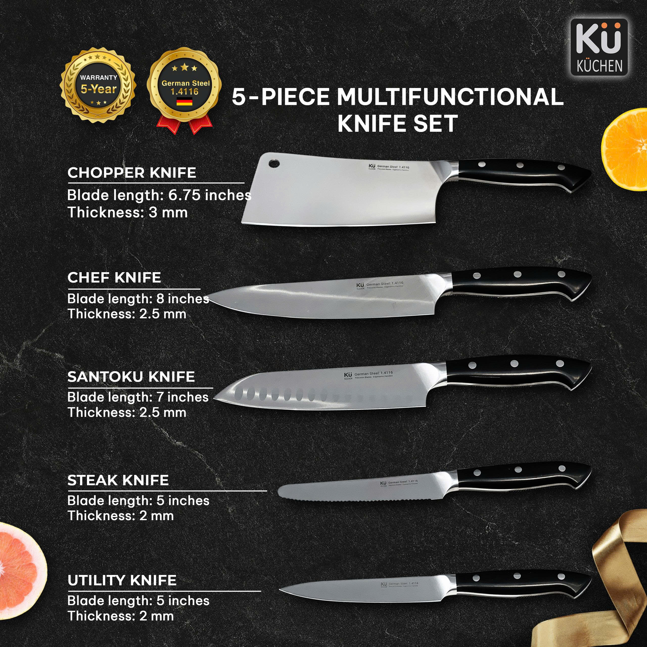 • 5 versatile knives for all kitchen tasks: chopping, slicing, peeling, and more