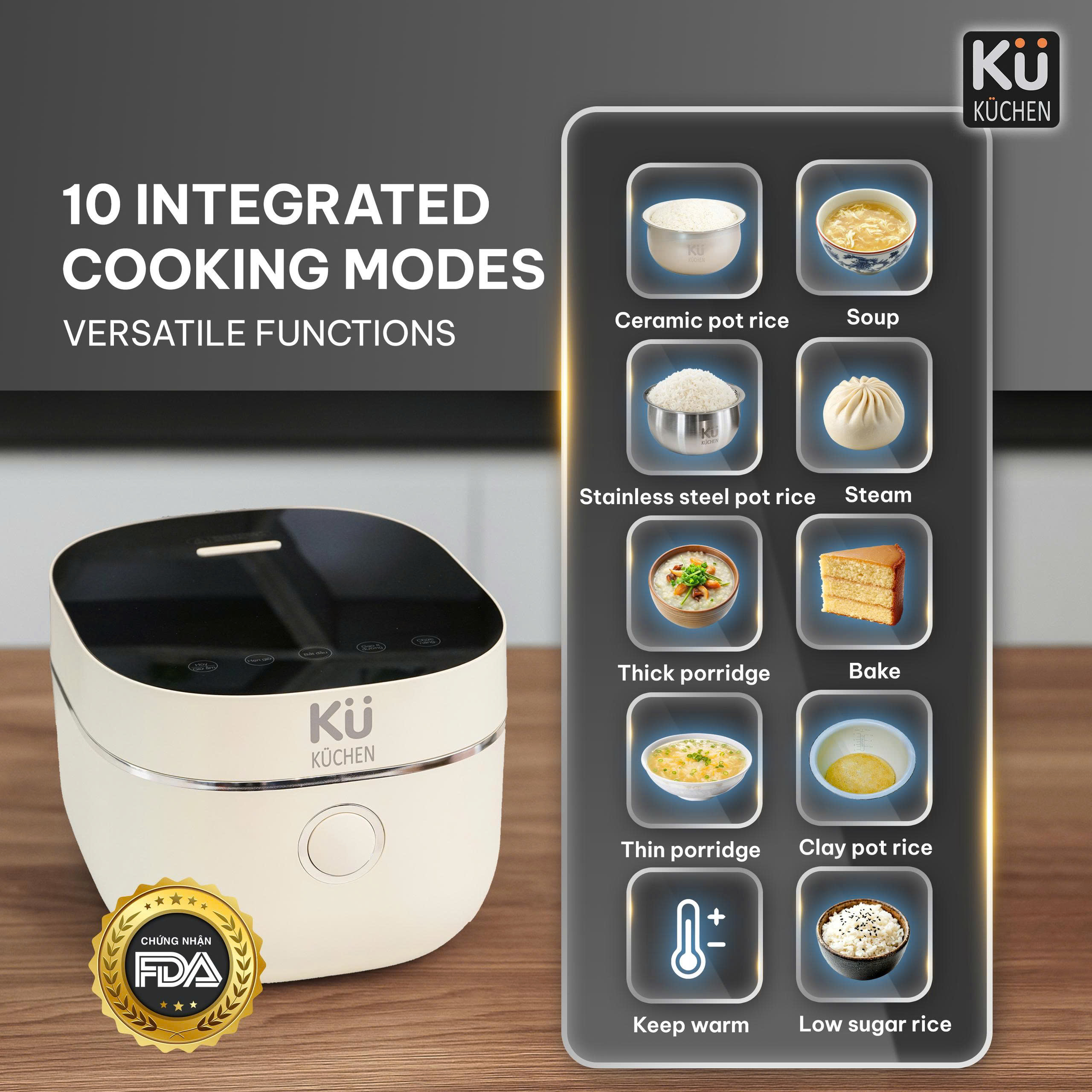 • 10 cooking modes including low-sugar, porridge, steaming, and more.